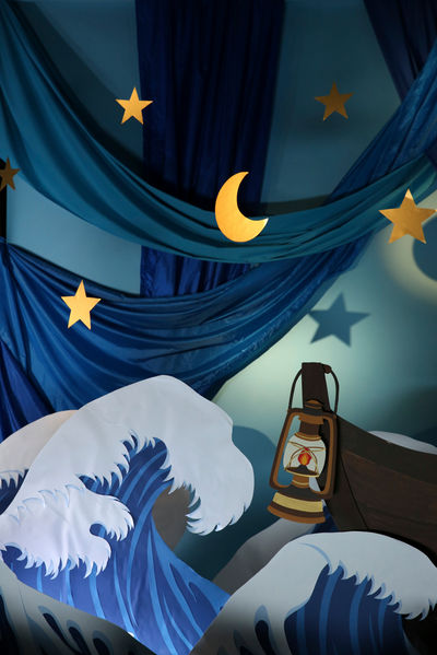Inspired by traditional Japanese art prints, the paper set design mimics the ocean and features paper koi carpers jumping out of the moving water whilst seagulls fly above. The set transforms from day into night, with the iconic red sun slowly changing into a golden sky with a crescent moon and stars.